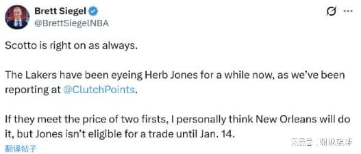 根据记者布雷特-西格尔报道,湖人正式追求铁闸赫伯特-琼斯,之前一直是迈克尔-斯科托传出的消息,如今也算得到证实。不过对手鹈鹕胃口很大,据说除了配平合同外,还要价至少两个首轮签,这有可能吓退湖人和其他球队。